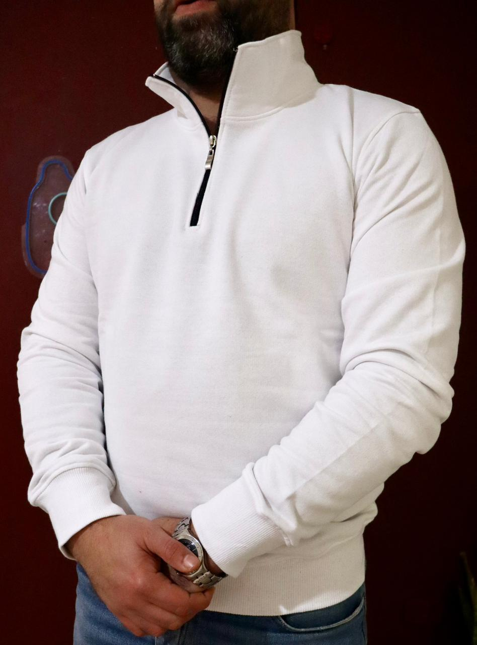Sweat-shirt ZIP UP à manche long avec une coupe classique et un col cheminée avec fermeture zippée sur le devant, straight de couleur Blanc 100% coton ajustés et confortables pour tous les jours et les soirées car il peut être associé à un jogging, un Jean, un chino... Comme il vous plaira.
