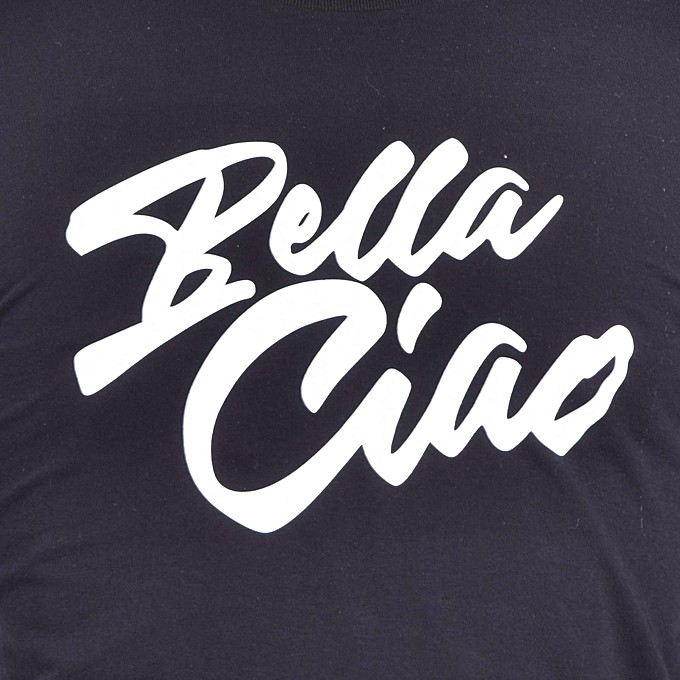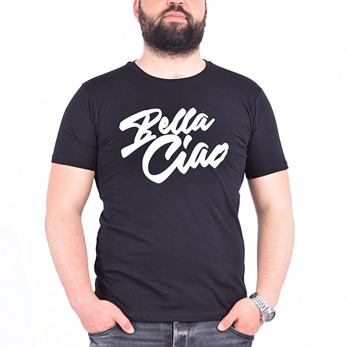 Ce T-Shirt possède un imprimé sur l'avant (Bella Ciao) peut-être porté tout seul ou sous une chemise ouverte.